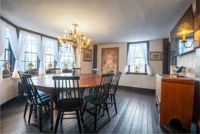 Above the round, pumpkin pine table, capable of seating ten with ease, hangs a chandelier whose simple elegance pays quiet homage to early American tradition. Its candle-like bulbs cast a warm, steady glow—an affirmation that the practice of sharing meals, stories, and seasons is as old as the house itself. Sconces along the walls echo that same golden light, recalling the era when evenings were lit by flame and conversation lasted long after dusk.