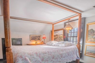 Here, beneath the gentle pitch of the colonial roofline, a tall four-poster bed stands like a sentinel of early American craftsmanship. Its posts, worn smooth by time, frame a space that feels both intimate and enduring, a reminder that generations once sought their rest beneath these very rafters.
